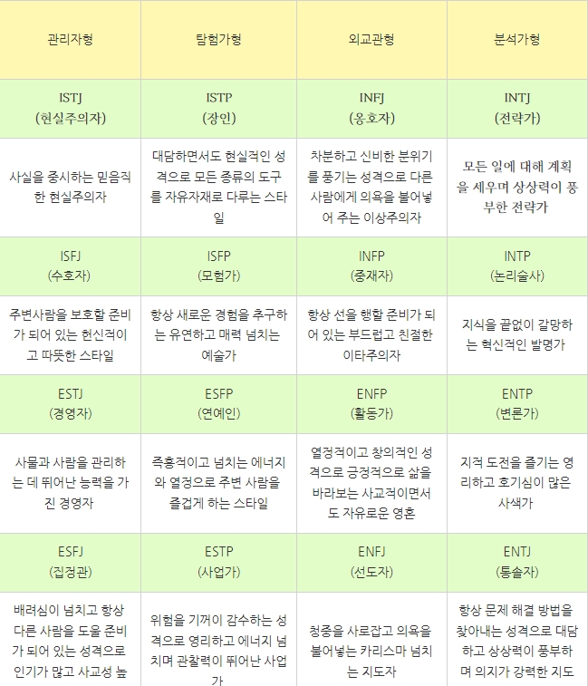 오늘은 MBTI에 대해 알아보았다. 사람의 성격을 16가지 지표로 다 나눈다는 게 사실 쉽지 않은 부분이지만 대표적인 16가지의 유형으로 나의 MBTI는 어느쪽이라는 것을 조금이나마 쉽게 파악할 수 있는 부분이 아닌가 싶다.
