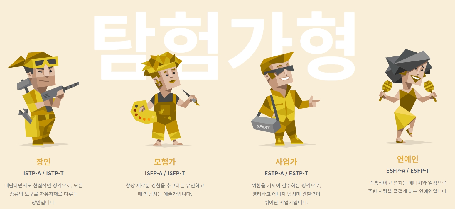- 탐험가형 : 경험주의자로써 날마다 새로운 재미를 찾고 자유로움을 추구