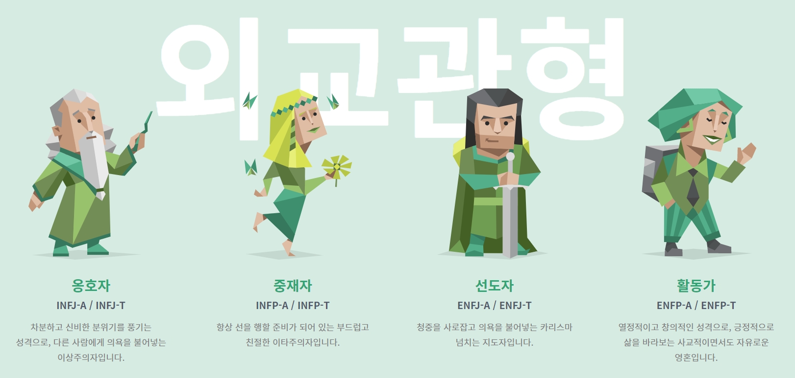 - 외교관형 : 이상적인 생각을 많이 하고 그런 기질을 타고났으며 인간에 대한 이해가 발달