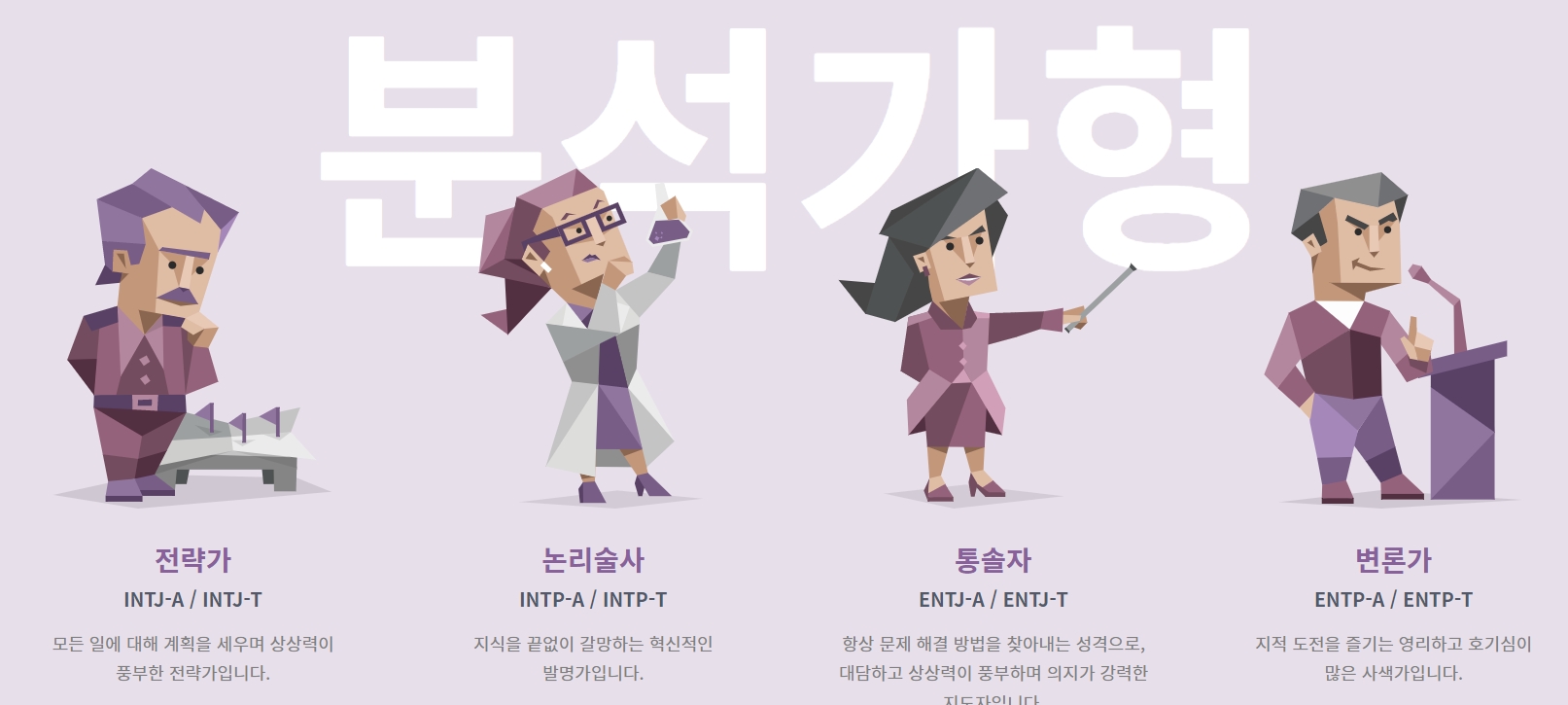 - 분석가형 : 분석가형은 있는 그대로를 분석하고 합리적이고 공정함을 추구
