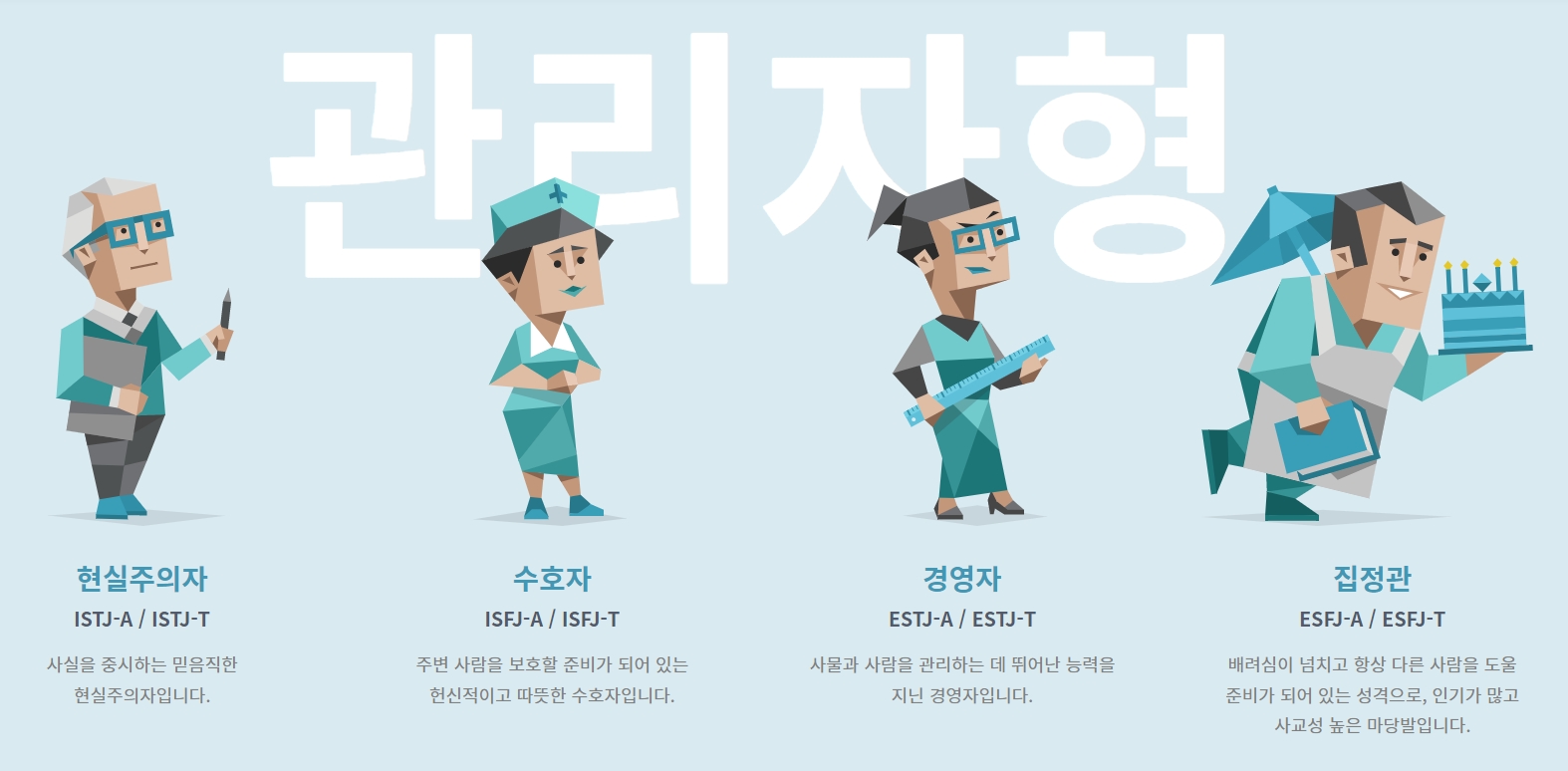 - 관리자형 : 기본적인 질서 등을 잘 지키며 계획을 세우고 약속을 지키는 편으로 타인에게 인정받길 좋아함