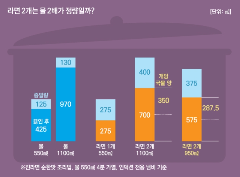 라면 1개의 가장 최적의 물 양은 500ml라고 한다. 다만, 2개를 끓일때는 과연 1,000ml를 넣으면 가장 맛있을까?