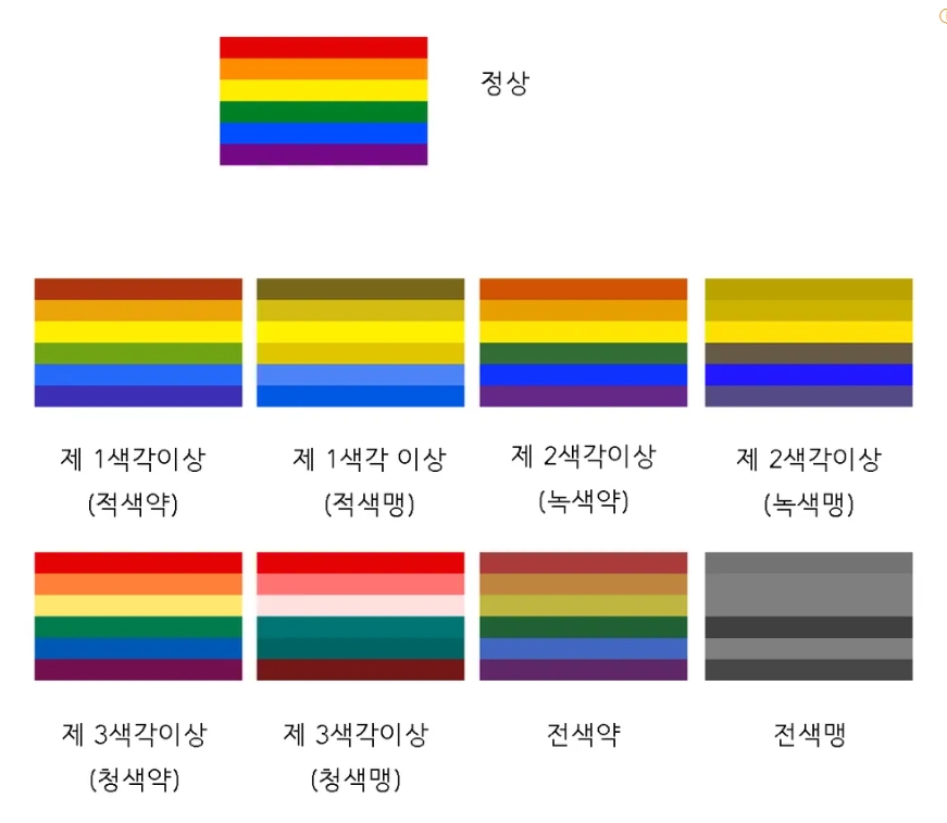 위와 같이 색맹과 색약은 다양하다. 8가지 이상으로 나눌 수 있으며 전 색맹은 색깔의 진하기와 연하기만 구분될 뿐 그냥 흑백으로 보는 것 같다. 그래도 '청색약'이 정상과 가장 비슷하게 보이는 것 같다.