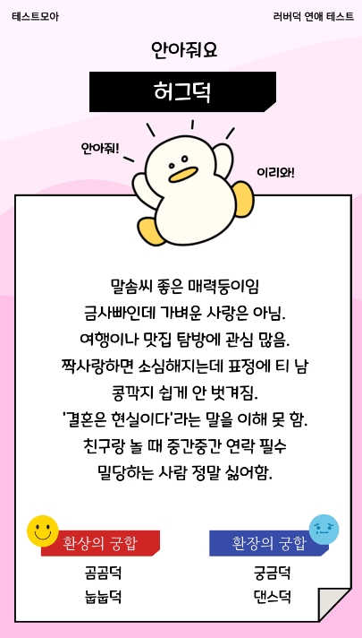 | 러버덕 | ENFJ | 허그덕 | ENFP |