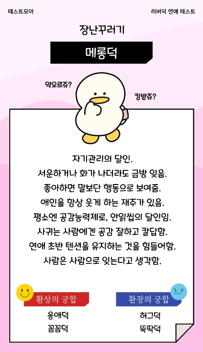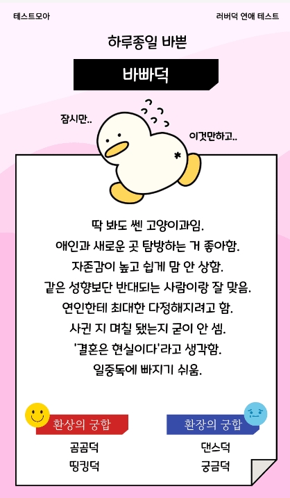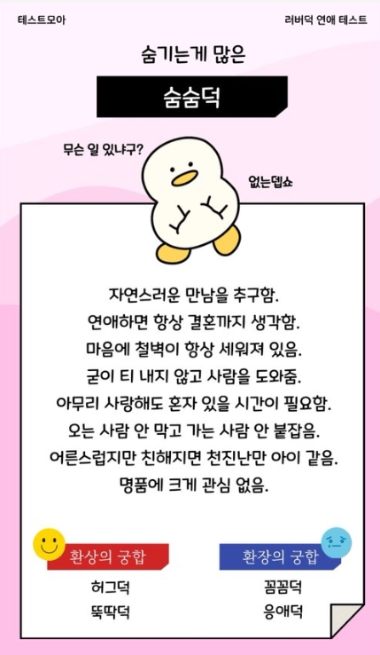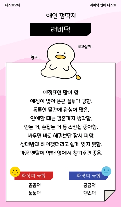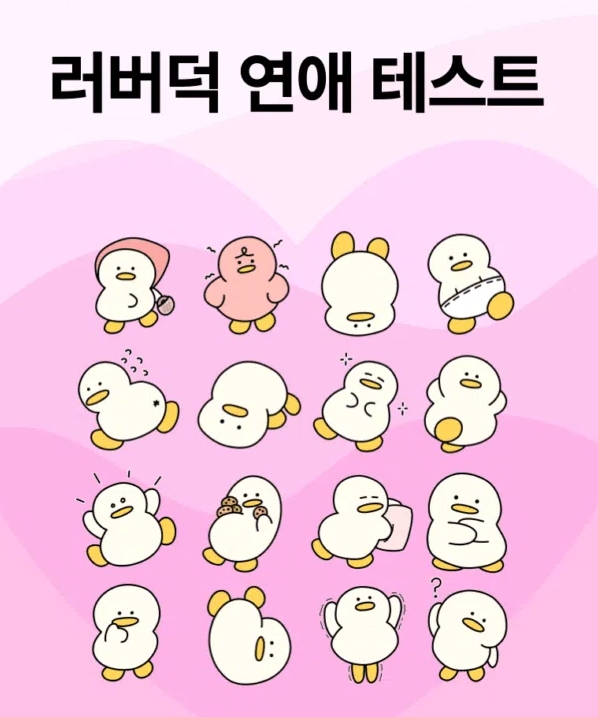러버덕 연애 테스트가 있다고 해서 알아볼려고 합니다. MBTI로 나오는데 나와 잘 어울리는 귀여운 오리를 찾아가는 테스트입니다. 러버덕,바빠덕,허그덕,뚝딱덕 등과 같이 귀여운 명칭의 16가지 오리 중 나와 맞는 러버덕을 찾아보세요.