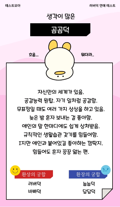 | 숨숨덕 | INFJ | 곰곰덕 | INFP |