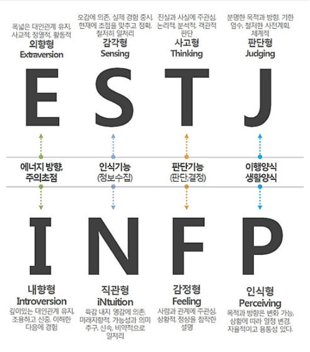 대부분 다 아시는 내용을 다시 한 번 확인하시라고 올렸습니다. E(외형), I(내향형) / S(감각형), N(직관형) / T(사고형), F(감정형) / J(판단형), P(인식형) 으로 확인할 수 있습니다.