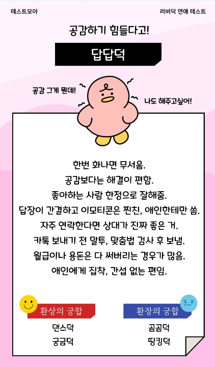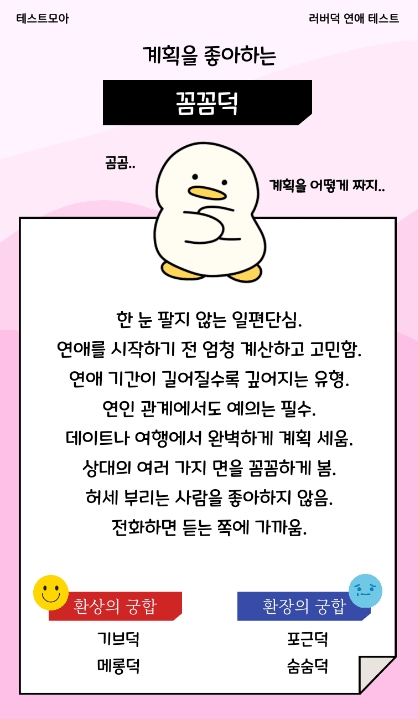 | 궁금덕 | ESTJ | 메롱덕 | ESTP |