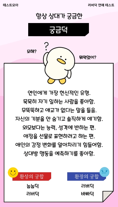 오늘은 러버덕 연애테스트에 대해 알아보았습니다. MBTI 테스트도 워낙 다양한 방식으로 많이 나와서 재밌게 테스트 해볼 수 있는 것 같습니다.