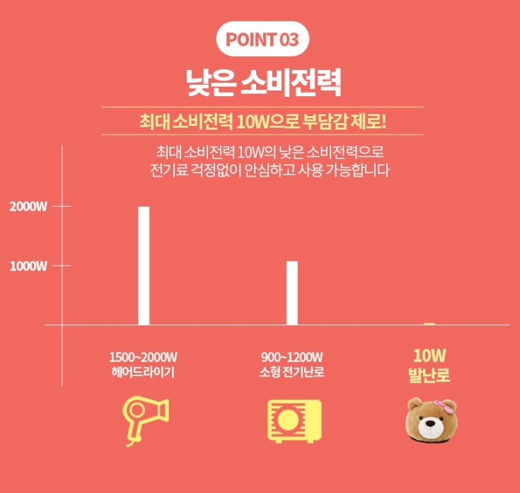 | 화상위험 제로, 소음 제로 | 피부에 닿아도 안전하며 화상위험이 전혀없는 히터로 소음도 없습니다. |